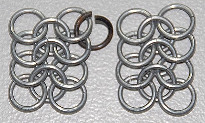 | Schritt 3: | Die dritte Reihe wird angefügt, in dem ein offener Ring durch zwei benachbarte Ringe ein und derselben Reihe gezogen und danach geschlossen wird. | |