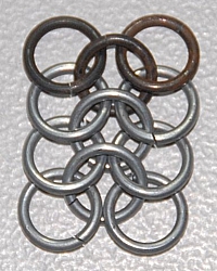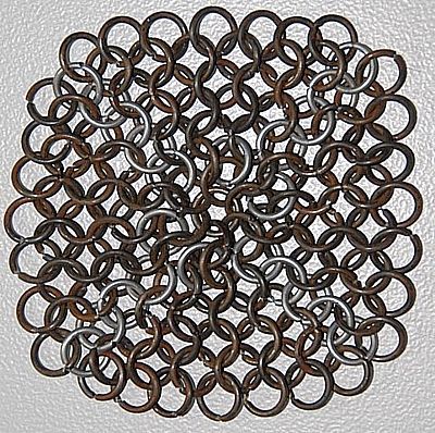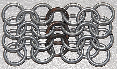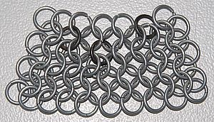 | Das folgende Bild zeigt die ersten acht Reihen einer Kettenhaube. Ab der vierten Reihe wurden die Erweiterungsringe (blank) immer an denselben Stellen eingesetzt. Da die Erweiterungsringe an vier Stellen je Reihe eingehängt wurden, hat das Kettengeflecht die Form eines Viereckes angenommen. Mit jeder Erweiterungsnaht, die hinzugefügt wird, erhöht sich die Anzahl der „Ecken“ des Geflechtes um 1. | |